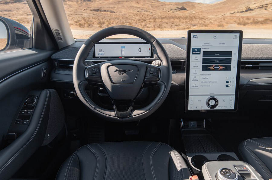 Tesla задала моду на автомобили с салонами, в которых все внимание сосредоточено на технологиях, и теперь другие производители следуют этому шаблону. Салон Mach-E кажется более теплым в сравнении с Model Y. Ford позаимствовали некоторое идеи у Tesla, например, скрытые отверстия системы кондиционирования и большой дисплей в центре. Отличается Mach-E необычным переключателем передач и наличием второго дисплея, выполняющего роль приборной панели. Серая ткань, прикрывающая решетку динамиков и приборную панель, добавляет Mach-E некоторой премиальности. Для Ford такой минималистичный дизайн салона что-то совершенно новое.