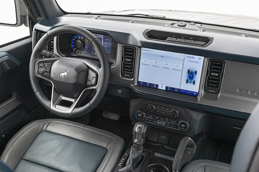 Здесь Ford Bronco Outer Banks демонстрирует свои сильные стороны. Салон внедорожника обладает удобной компоновкой различных элементов, в особенности дополнительных элементов управления. Автомобиль обладает большим количеством различных современных технологий, а центральное место в салоне занимает большой 12-дюймовый сенсорный дисплей с высоким разрешением. Вместо механического управления полным приводом в центральной консоли находятся электронные переключатели, что позволило сэкономить немного места и увеличить вместимость отсеков для мелочей, а также разместить в центральной консоли площадку для беспроводной зарядки гаджетов. Однако Bronco страдает от плохой подгонки деталей, обилия дешевого пластика с зазорами и швами, а некоторые детали кажутся ненадежно закрепленными. Все это отнюдь не улучшает впечатление о качестве и надежности автомобиля.
